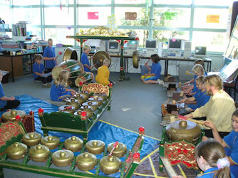The real thing. A Central Javanese gamelan brought to your school. Your students will actually learn to play a genuine gamelan song on a genuine gamelan orchestra. Aaron offers gamelan workshops for schools and colleges. Instruments include saron, bonang, bonang penerus, kendang, kempul, kethuk, kenong and gong. Enough instruments to seat 26 students at a time. Workshops are adjusted to suit the particular age level of the students.