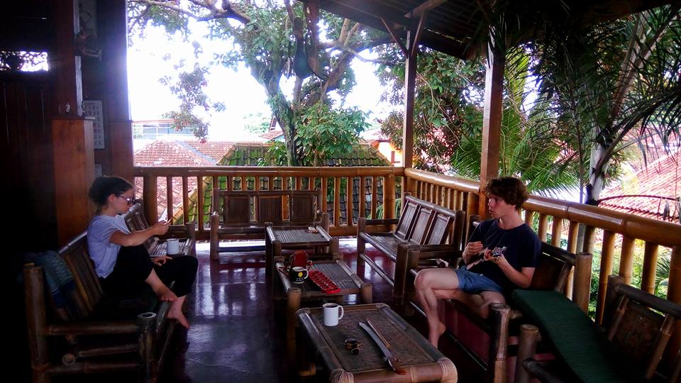 Designed in an open plan antique/rustic style with teak panels. Two bedrooms, large open area, a kitchenette and bathroom. Being the second story and open plan, it is very airy and is up away from the mosquitoes. The bedrooms also have excellent ventilation and ceiling fans. The large main bedroom is 4.5m x 7 m with a king sized bed. The second bedroom is 2.2m x 6 m and has a bunk and a single bed. There is a single bed in the large open area. There is a bathroom with a hot shower and Western style toilet. The main bedroom has a kitchenette with a stove and bar fridge. It has wifi. There is a gamelan set. The dwelling has a combined area of 12m x 12m. Several mosques are quite near so the call to prayer is quite noticeable.