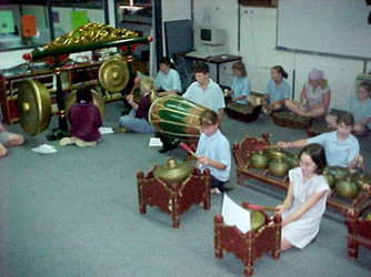 The real thing. A Central Javanese gamelan brought to your school. Your students will actually learn to play a genuine gamelan song on a genuine gamelan orchestra. Aaron offers gamelan workshops for schools and colleges. Instruments include saron, bonang, bonang penerus, kendang, kempul, kethuk, kenong and gong. Enough instruments to seat 26 students at a time. Workshops are adjusted to suit the particular age level of the students.