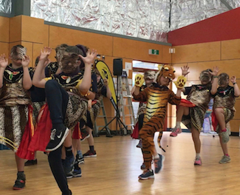 Nita has been immersed in Indonesian dance since a child, and now runs Indonesian dance workshops for schools. The dances are chosen to suit the age level of the students, and will be chosen from Tari Topeng (mask dance), Tari Satria (warrior), Tari Pongan (shepherd), Tari Kijang (deer), Tari kuda kepang (flat bamboo horse dance), Tari Kupu-kupu (butterfly), Tari kelinci (rabbit), Tari Blek dik dot (Indonesian clown motif), Tari Saman (from Aceh), Tari Rampak (funny group dance from Java), Tari Gembira (the dance of joy) and Tari Lilin (candle dance). Tari tempurung (coconut), Tari Bamboo gila (bamboo dance), Poco-poco (a modern aerobics style of dance) from Ambon and the Kecak dance/drama). We put some dances and gamelan into the story if it is to be performed to the school at the end of the day. For example in the story when Rama enters the wild forest full of strange creatures, we get one class to perform tari topeng, and when Hanoman's army come forward we get another to perform Tari Rampak etc. We use gamelan in the intro scene, exit scene, battle scene and special effects. We have now added "The legend of Candi Prambanan", "The dancing pig" (a Balinese folk tale) and "Kancil, the clever mouse deer" to our role play/dance drama repertoir.